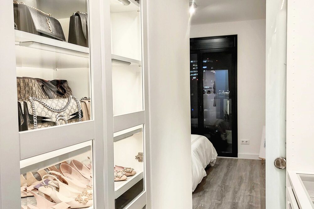 Y, por supuesto, hicimos realidad el ansiado vestidor de Carla. Aprovechamos cada centímetro disponible y, no sabemos si nos ha quedado mejor que el de Carrie, pero Carla está encantada. Nuestra prioridad fue jugar con colores blancos y muchos cristales, para ganar en profundidad y que todo fuese muy visible. La iluminación es también un punto muy destacable, ya que la renovamos por completo e instalamos luces LED’s, más sostenibles y duraderas.